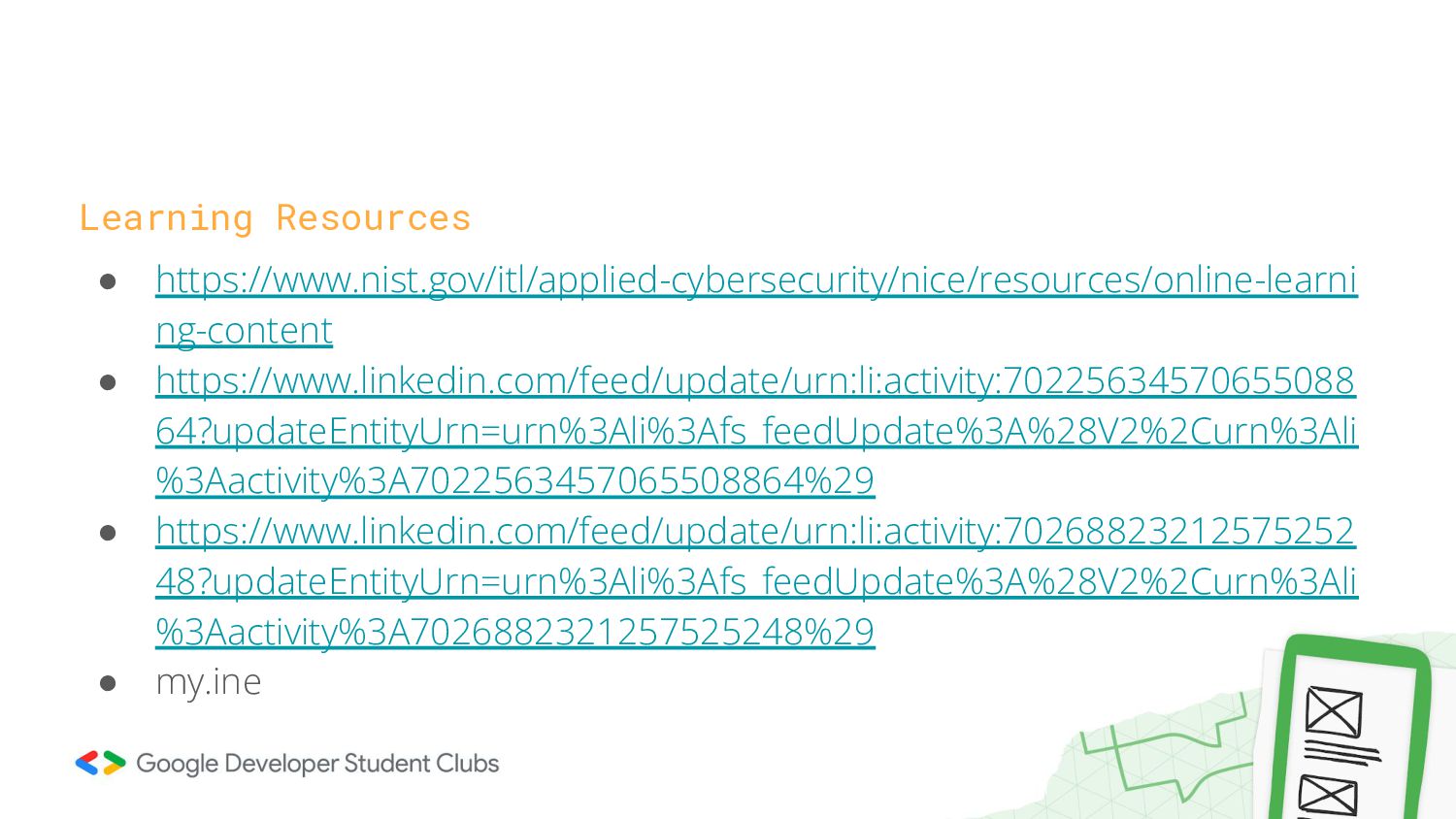 • https://www.nist.gov/itl/applied-cybersecurity/nice/resources/online-learni ng-content • https://www.linkedin.com/feed/update/urn:li:activity:70225634570655088 64?updateEntityUrn=urn%3Ali%3Afs_feedUpdate%3A%28V2%2Curn%3Ali %3Aactivity%3A7022563457065508864%29 • https://www.linkedin.com/feed/update/urn:li:activity:70268823212575252 48?updateEntityUrn=urn%3Ali%3Afs_feedUpdate%3A%28V2%2Curn%3Ali
