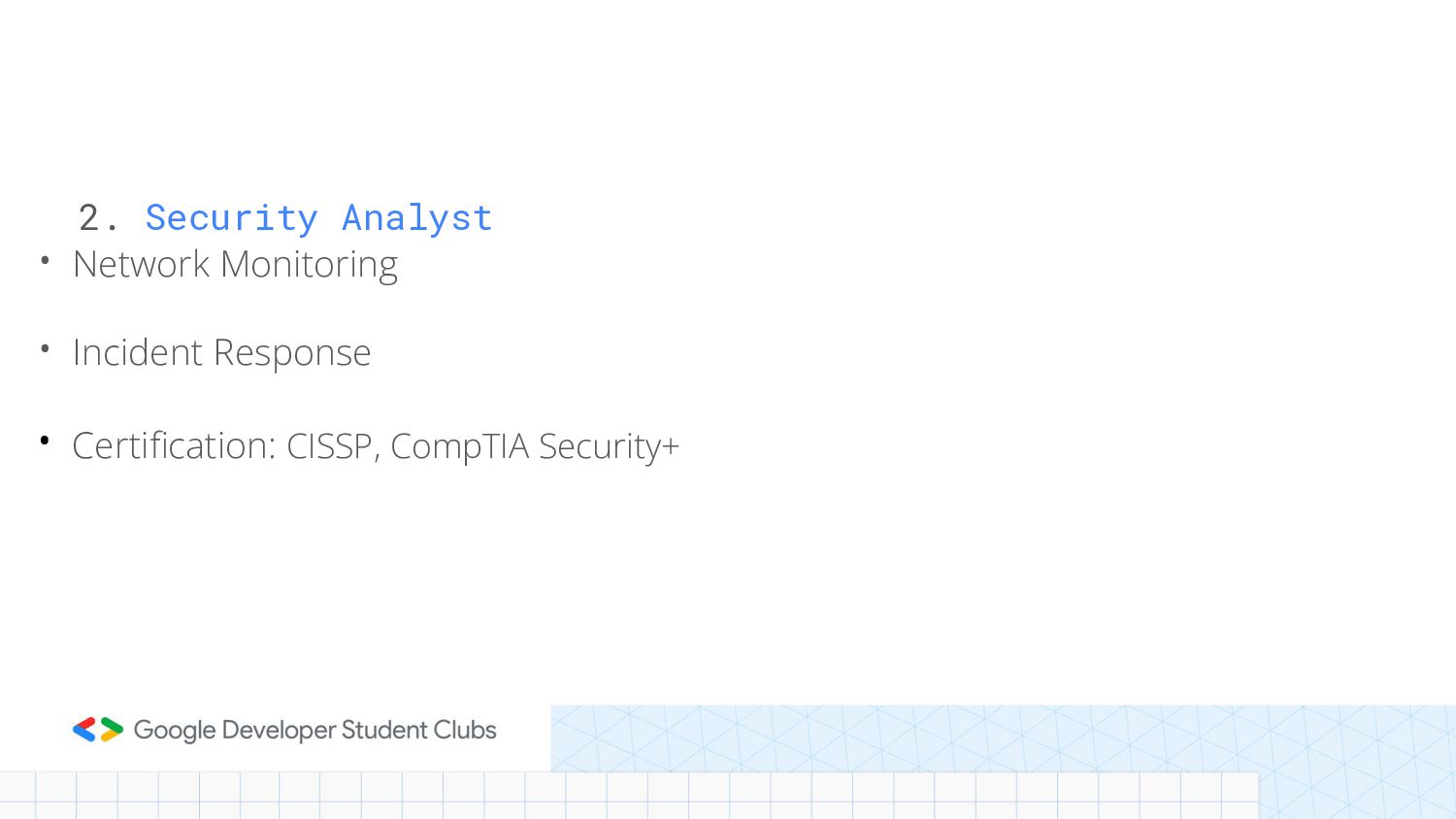 2. Security Analyst • Network Monitoring • Incident Response •