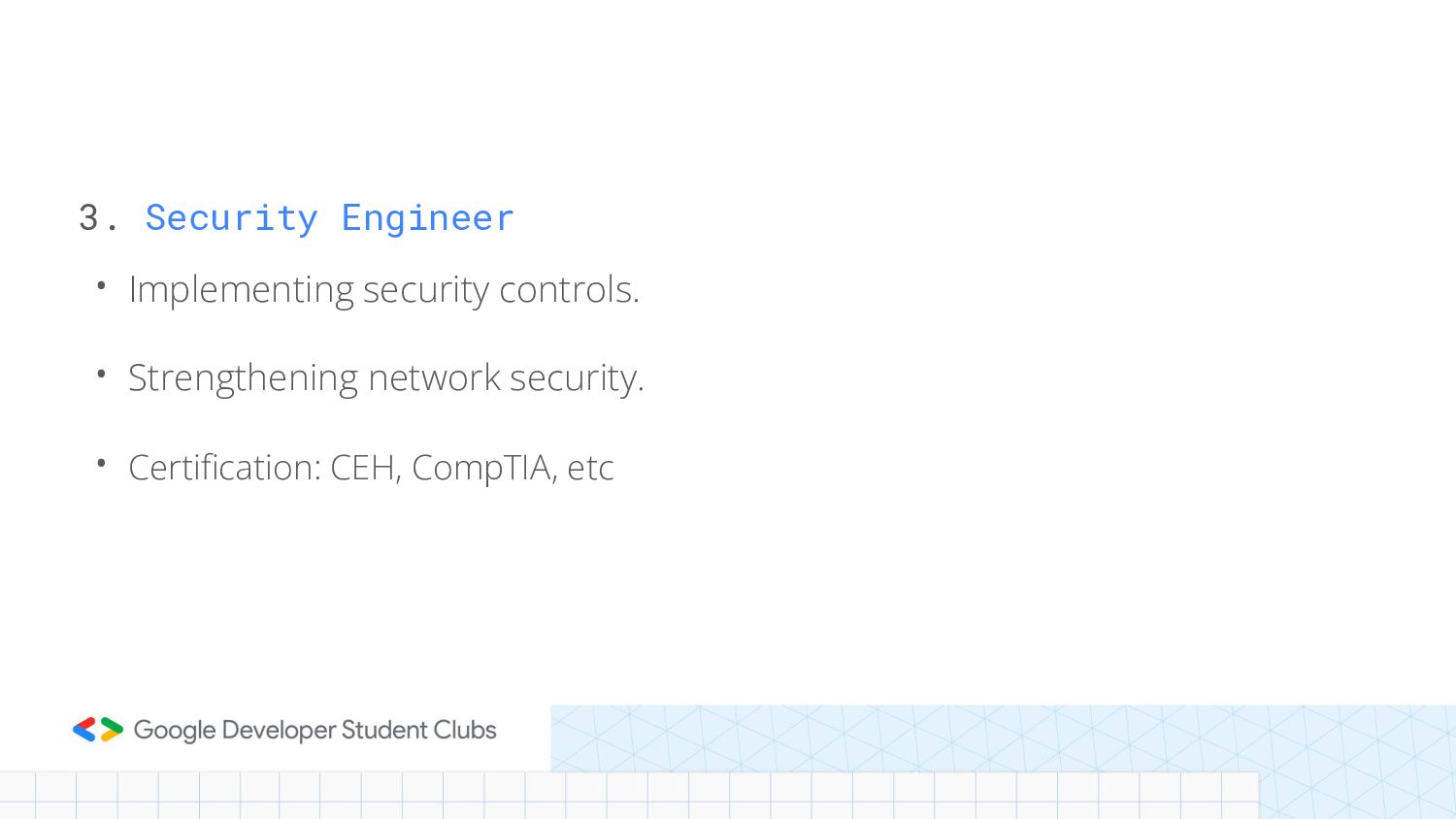 3. Security Engineer • Implementing security controls. • Strengthening network