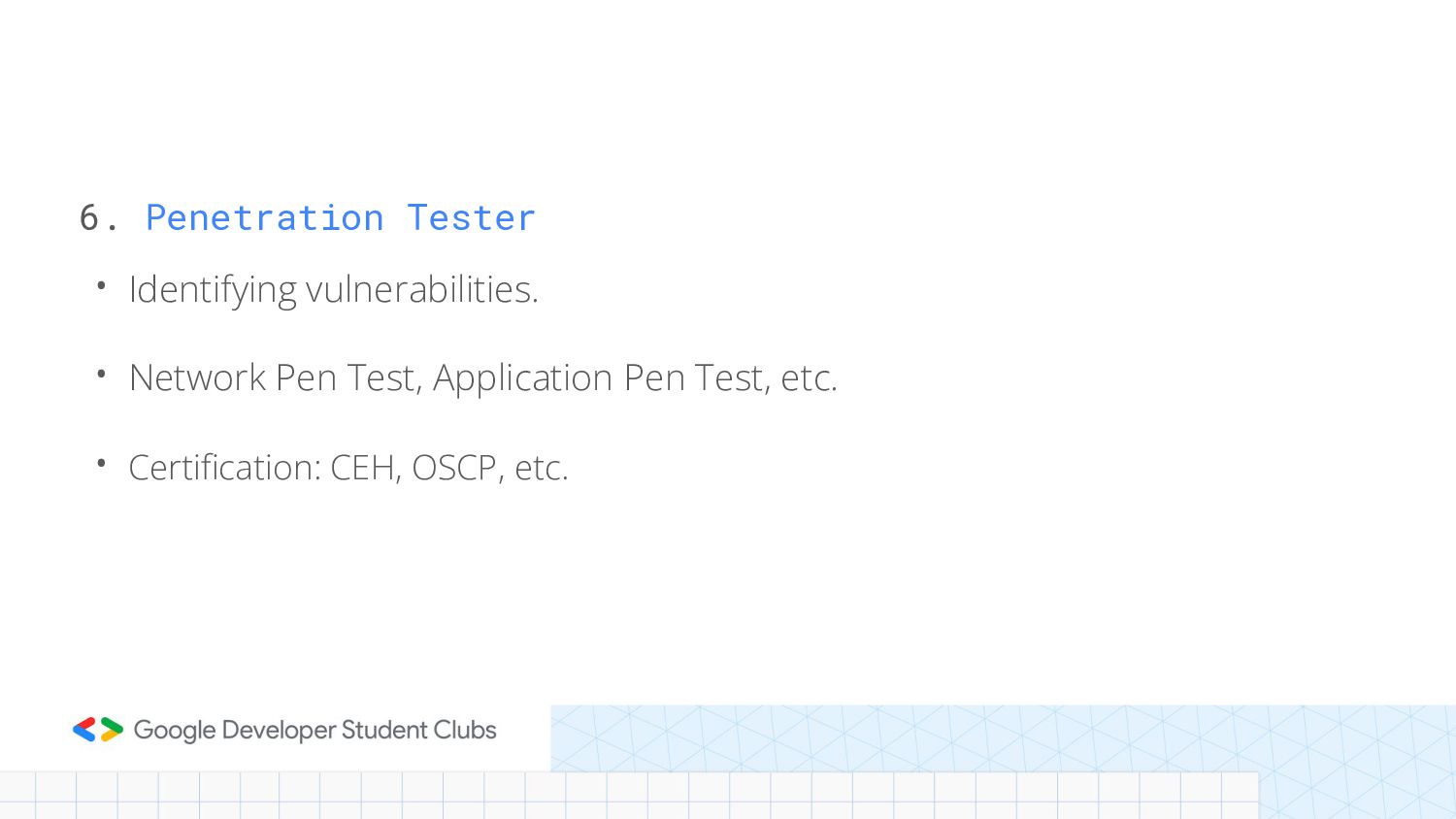 6. Penetration Tester • Identifying vulnerabilities. • Network Pen Test,