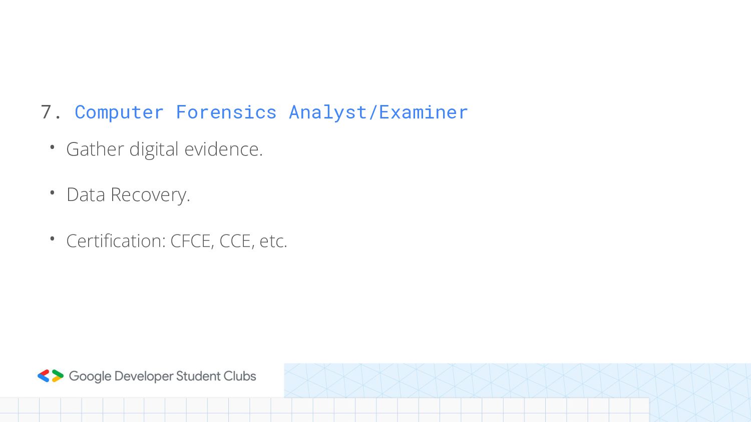 7. Computer Forensics Analyst/Examiner • Gather digital evidence. • Data