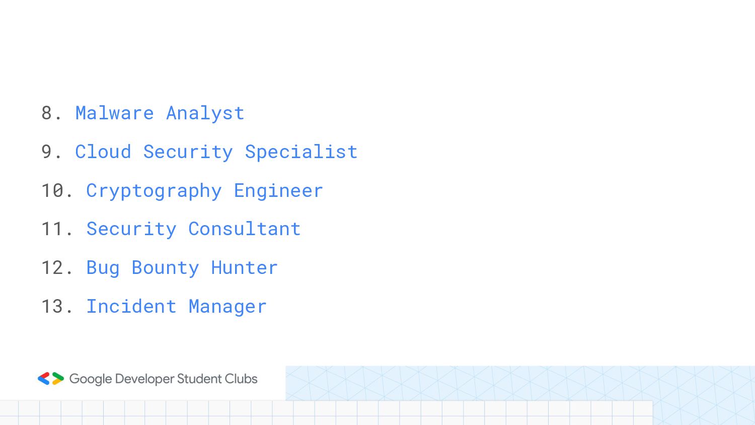 11. Security Consultant 12. Bug Bounty Hunter 13. Incident Manager