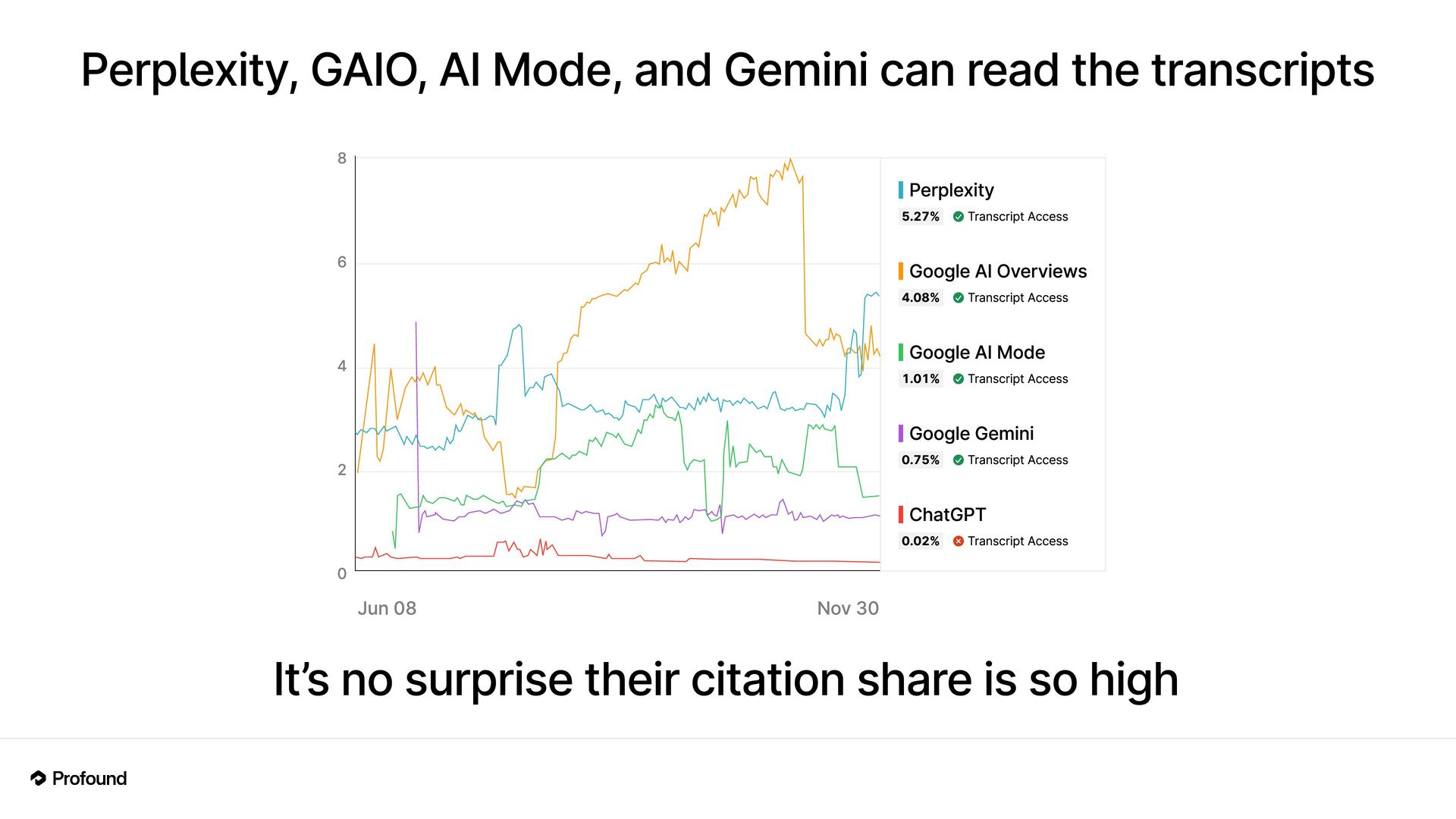 It’s no surprise their citation share is so high 2 0 4 6 8 Perplexity 5.27% Transcript Access Google AI Overviews 4.08% Transcript Access Google AI Mode 1.01% Transcript Access Google Gemini 0.75% Transcript Access ChatGPT 0.02% Transcript Access