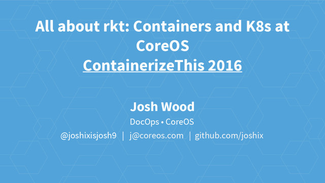 Kubernetes @ v1.3 • Bring up a cluster, node, or pod with rkt as the executor • Now/Next (K8s v1.4 & beyond): ◦ kubectl attach (CRI and pod mutability) ◦ Port-forwarding for alternate stage1s ◦ Your contributions, suggestions, and experiments!