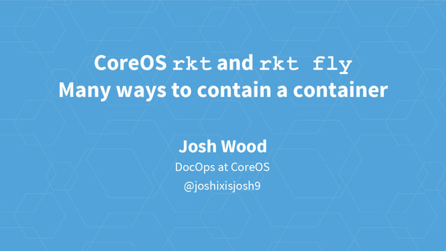features of rkt/appc • Reduced isolation for privileged components • chroot file system isolation only • Has access to host-level mount, network, PID name spaces • Method for shipping k8s kubelet in CoreOS