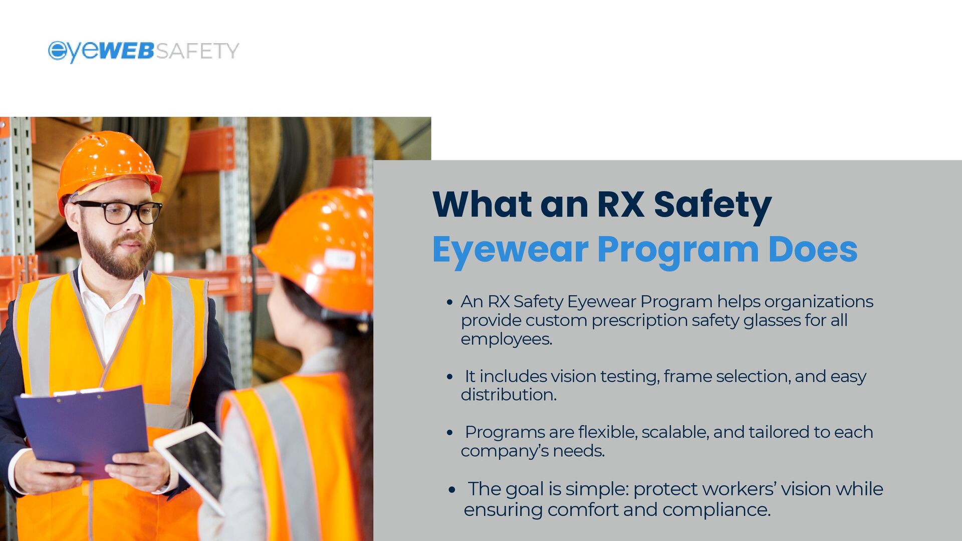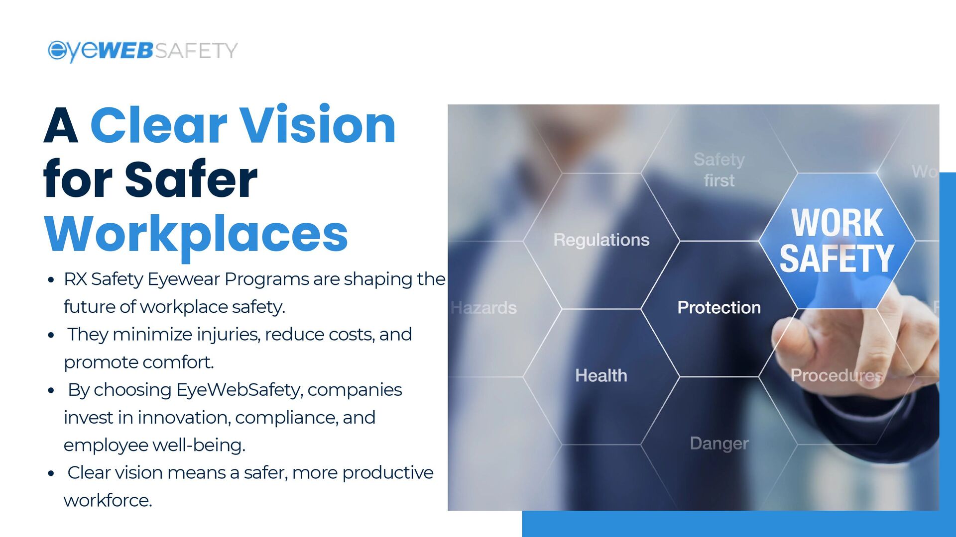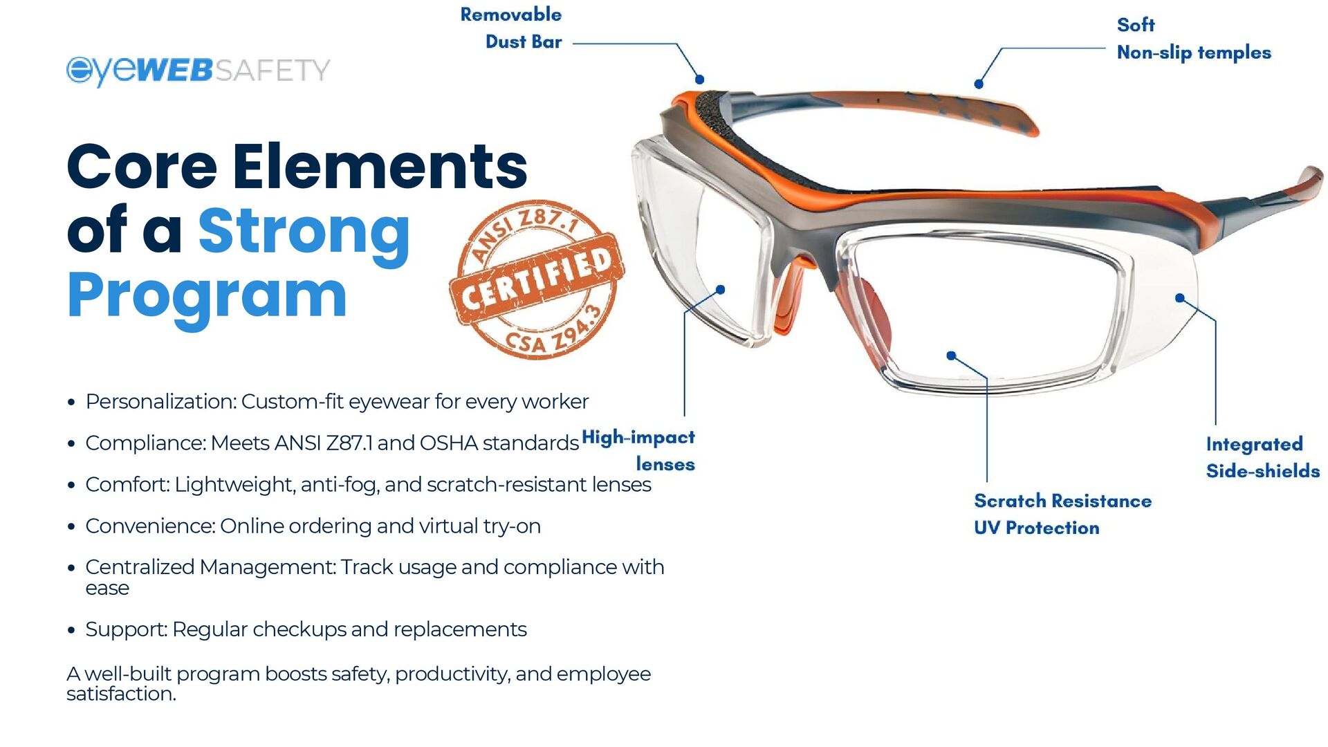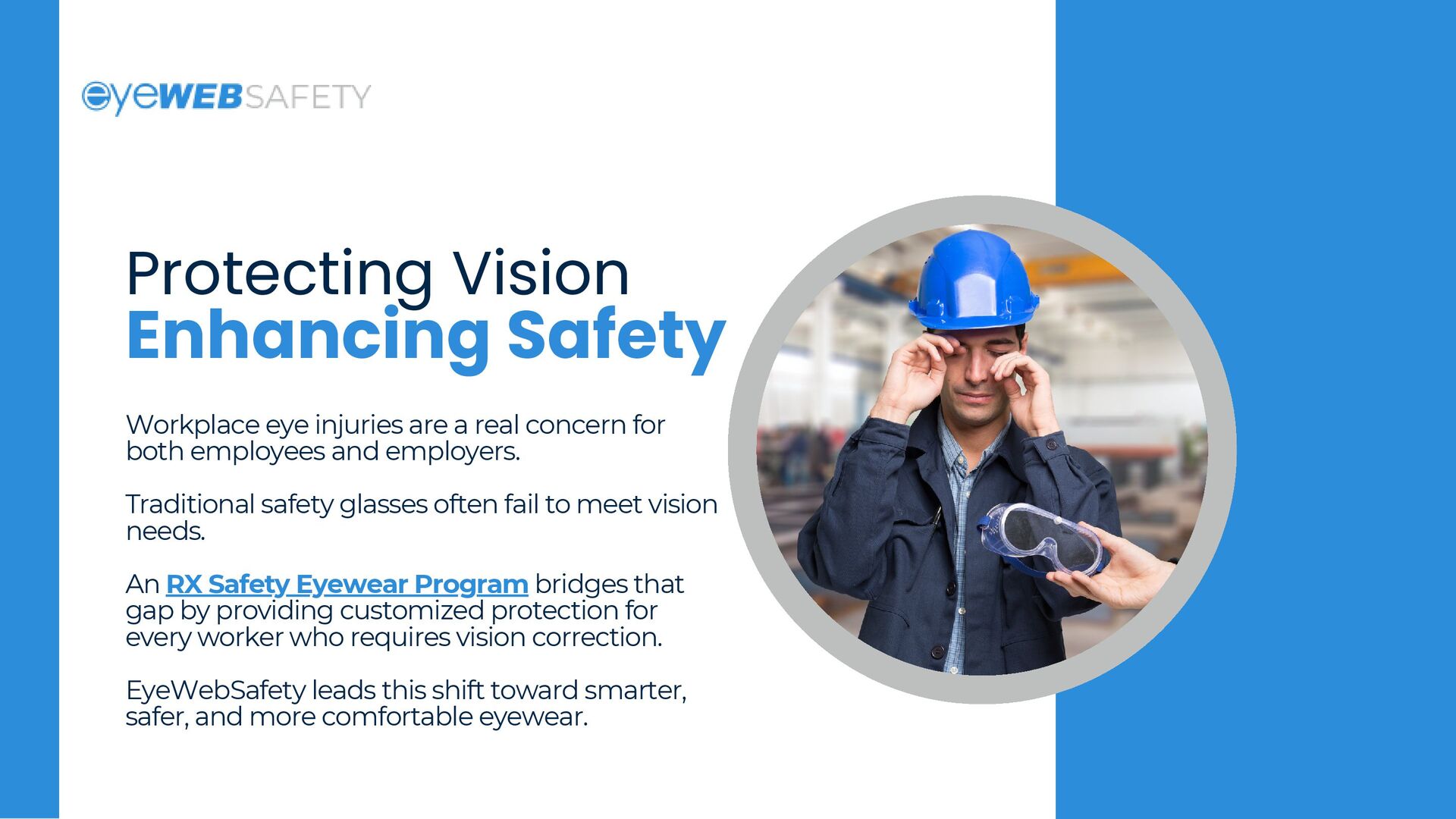 Every job deserves clear vision and complete protection. RX Safety Eyewear Programs combine prescription accuracy with industrial-grade safety standards. EyeWebSafety brings technology, comfort, and compliance together in one simple platform. Keep your employees safe, confident, and focused at work.