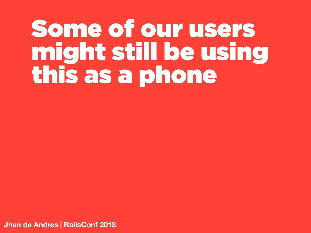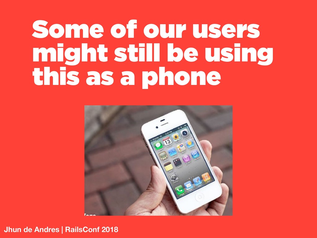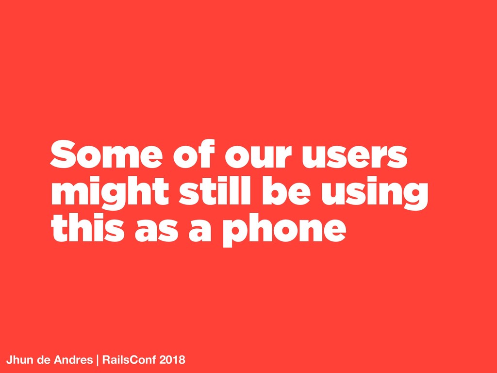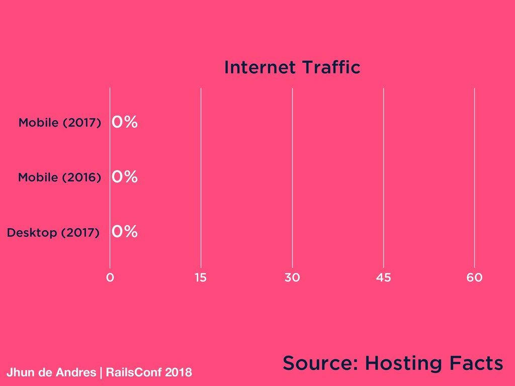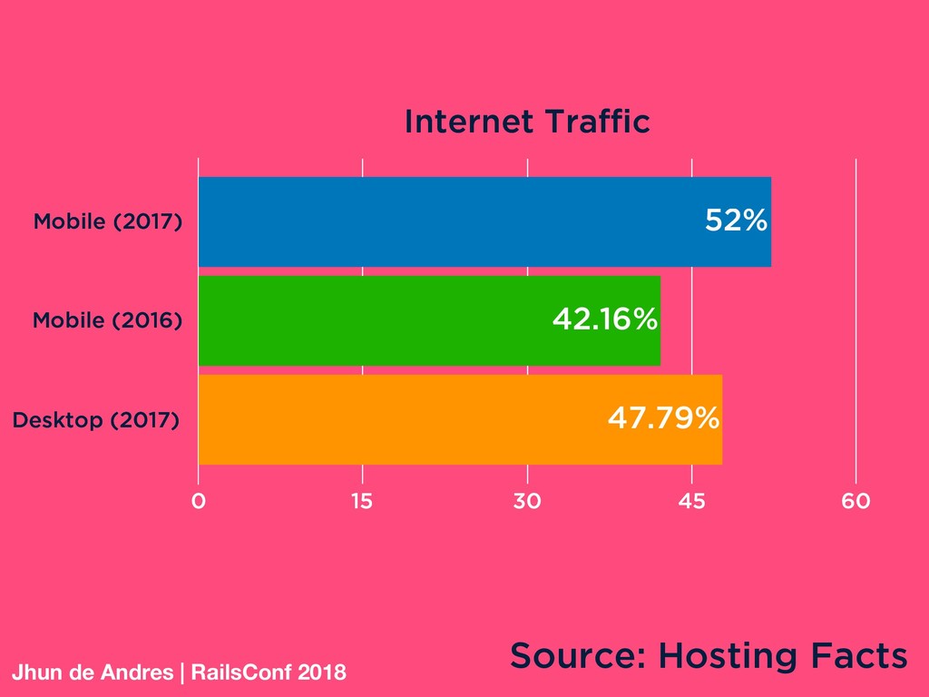 30 45 60 47.79% 42.16% 52% Internet Traffic Mobile (2017) Mobile (2016) Desktop (2017) 0 15 30 45 60 47.79% 42.16% 52% Source: Hosting Facts There are more mobile Internet users than desktop Internet users. There are 3.5 billion global mobile Internet users as of August 2017. “ Jhun de Andres | RailsConf 2018