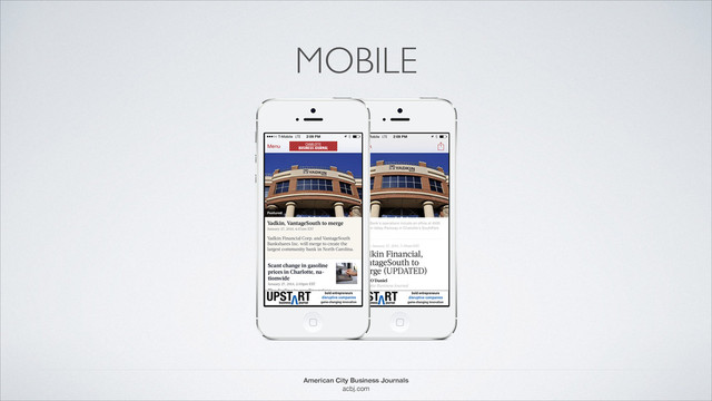 up launching a mobile-focused newsletter to share data with the company to help us understand how mobile affects us. • We’ve been careful to distinguish between pictures of products and, well, actual products, so we’re getting away from mockups. American City Business Journals acbj.com