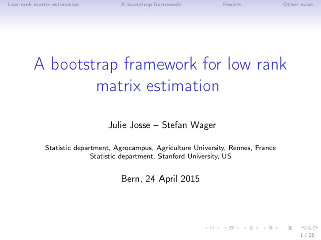 data ⇒ Model: X ∈ Rn×p ∼ L(µ) with E [X] = µ of low-rank k Binomial noise model: Xij ∼ 1 1−δ Binomial (µij , 1 − δ) Poisson noise: Xij ∼ Poisson (µij ) (Binomial with δ = 0.5) ⇒ ˆ µk = k l=1 ul dl v l ⇒ Bootstap estimator = noising: Xij ∼ Poisson (Xij ) ˆ µboot = XB B = argminB EX∼L(X) X − XB 2 2 ⇒ Estimator robust to subsampling the obs used to build X 21 / 28