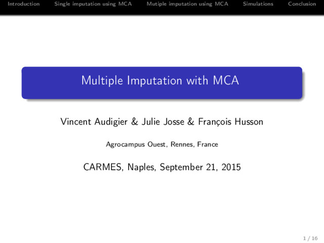 Conclusion Iterative MCA (Josse et al., 2012) Iterative MCA algorithm: 1 initialization: imputation of the indicator matrix (proportion) 2 iterate until convergence (a) perform the MCA, i.e. SVD of X, 1 K (DΣ )−1 , 1 I 1I ˆ UI×S , ˆ Λ1/2 S×S , ˆ VJ×S , (b) imputation of the missing values with ˆ XI×J = ˆ UI×S ˆ Λ1/2 S×S ˆ VJ×S (c) column margins DΣ are updated V1 V2 V3 … V14 V1_a V1_b V1_c V2_e V2_f V3_g V3_h … ind 1 a NA g … u ind 1 1 0 0 0.71 0.29 1 0 … ind 2 NA f g u ind 2 0.12 0.29 0.59 0 1 1 0 … ind 3 a e h v ind 3 1 0 0 1 0 0 1 … ind 4 a e h v ind 4 1 0 0 1 0 0 1 … ind 5 b f h u ind 5 0 1 0 0 1 0 1 … ind 6 c f h u ind 6 0 0 1 0 1 0 1 … ind 7 c f NA v ind 7 0 0 1 0 1 0.37 0.63 … … … … … … … … … … … … … … … ind 1232 c f h v ind 1232 0 0 1 0 1 0 1 … ⇒ the imputed values can be seen as degree of membership 4 / 16