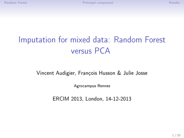 k-nearest neighbors, joint modeling: normal distribution, conditional modeling (van Bureen 1999): iterative regressions, etc. Categorical variables: k-nn, joint modeling: log-linear model, latent class model (Vermunt, 2008), conditional modeling: iterative logistic regressions, etc. Mixed data: • General location model (Schaefer, 1997) • Transform the categorical variables into dummy variables and deal as continuous variables (package Amelia) • MICE (conditional multivariate imputation by chained equations, van Bureen 1999): a model must be specied for each variable - iterative linear and logistic regressions (package mice) ⇒ Random forests (Stekhoven & Bühlmann, 2011) ⇒ Principal component method (Audigier, Husson & Josse, 2013) 3 / 20
