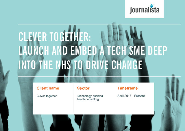 target health management journal HSJ to launch Clever Together with a co-branded campaign. This engaged 1000 senior NHS managers with our client’s platform, crowdsourcing 6000 ideas on 7-day working, creating high-value content for a 4-page feature. This led the front page of the magazine. 02 Over 12 brand new, high value business approaches quoted PR content as their main reason for getting in-touch. Including Monitor, NHS Improving Quality, HSJ, NHS England, Leeds Hospital Trust, Pennine Acute Trust. 03 Created a collaboration between our client, HSJ and NHS IQ on ambitious ‘Change Challenge’ project – biggest ever crowdsourced transformational change programme undertaken by the health sector. 04 Listed as Top-50 Innovator by HSJ and two HSJ awards won in partnership with clients for innovation and efficiency saving. 05 NHS England and Clever Together’s co-branded campaign Transform London was supported by a Journalista led social media and marketing campaign to engage 150 organisations across 32 London boroughs. 06 PR drove key-note speaker opportunities for Clever Together CEO Dr Pete Thomond at HSJ Summit, Financial Times Innovators and Monitor. 07 Reached over 10 million people with 47 pieces of PR-earned quality coverage to date across the Guardian, HSJ, local and regional media and The Financial Times. “JOURNALISTA’S IN-DEPTH CONNECTIONS WITH HEALTHCARE ARE SECOND TO NONE. THEIR RELATIONSHIP WITH THE EXECUTIVE EDITOR OF HSJ GAVE US THE INITIAL OPPORTUNITY TO DEMONSTRATE WHAT WE DO AND ENGAGE THE AUDIENCES WE WANTED TO TARGET. THEY DEMONSTRATED REAL CREATIVITY OPENESS AND TEAM WORKING. WE WOULD BE HAPPY TO RECOMMEND THEM. ” Dr Peter Thomond,