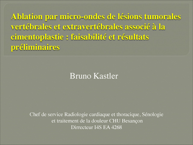 primitives, n=2/24. Secondaires, n=22/24 • Parties molles, n=6, Osseuse, n=18 dont 3 lésions ostéocondensantes • Localisations • Osseuses • Costales n = 7 • Sacrum, n=4 • Rachis, n=3 • Sternum, n=2 • Clavicule n = 1 • Ischion, n = 1 • Taille moyenne de la tumeur 47mm (12-120mm) ! ⦿ Dans 5 cas, Cimentoplastie combinée • Parties molles • Paravertebral, n=3 • Axillaire, n=1 • Periscapulaire, n=1 • Periclaviculaire, n=1