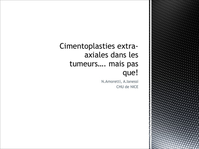 estimée entre 4 et 10 sur l’échelle numérique (EN moyen avant procédure = 6,4). ▪ 20 % des patients : score HAD combiné > 19 et un sous score de dépression supérieur ou égal à 8. Le sous score d’anxiété était supérieur ou égal à 8 chez 60 % des patients. Chez ces patients considérés comme symptomatiques d’anxiété ou de dépression, on n’a pas montré de différence significative concernant la douleur initiale ou la réponse antalgique par rapport aux patients sans symptômes anxio-dépressifs. ▪ Taux de survie à 12 mois : 70 % ▪ Faisabilité ▪ Au cours de l’hospitalisation, tous les patients inclus ont pu bénéficier d’une procédure de cimentoplastie menée à terme. La faisabilité était donc de 100%. ▪ Effet antalgique ▪ Durant la procédure, la douleur perçue était estimée entre 2 et 8 sur l’échelle numérique (4 en moyenne) ▪ Volume moyen de ciment injecté : 4,3 ml (4-10 ml).
