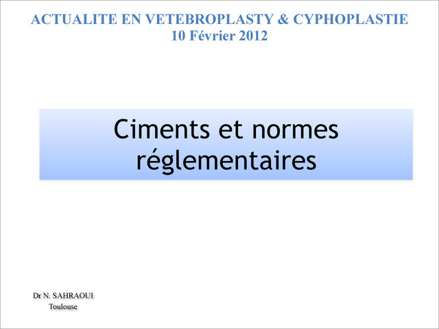 de la santé publique (à Article L.5211-1, article premier point 2.a) de la directive 93/42/CEE) » ! « On entend par dispositif médical tout instrument, appareil, équipement, matière, produit, à l’exception des produits d’origine humaine, ou autre article seul ou en association, y compris les accessoires et logiciels intervenant dans son fonctionnement, destiné par le fabricant à être utilisé chez l’homme à des fins médicales et dont l’action principale voulue n’est pas obtenue par des moyens pharmacologiques ou immunologiques ni par métabolisme, mais dont la fonction peut être assistée par de tels moyens ». Ciments et normes réglementaires • La notion de DM est un sujet jeune, définition apparue en 1994 dans CSP: • C’est quoi?