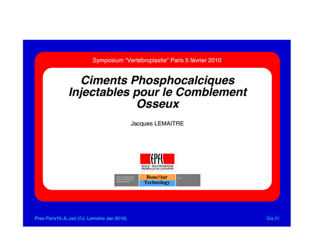 pour le Comblement Osseux Dia 01 BoneStar Technology S.A. Calcium phosphate bone substitutes for skeletal repair Symposium “Vertébroplastie” Paris 5 février 2010