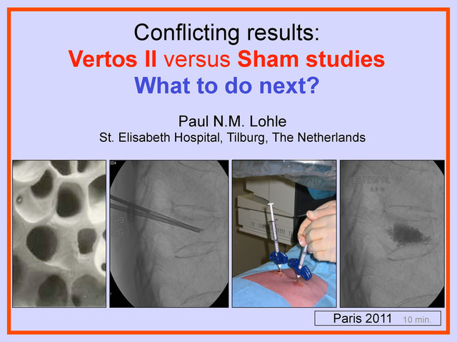 no benefit of PV • Vertos II study found effective pain relief after PV at acceptable costs. Kallmes DF, Comstock BA, Heagerty PJ et al. A randomized trial of vertebroplasty for osteoporotic spinal fractures. N Engl J Med 2009; 361(6):569-579. Buchbinder R, Osborne RH, Ebeling PR et al. A randomized trial of vertebroplasty for painful osteoporotic vertebral fractures. N Engl J Med 2009; 361(6):557-568 Klazen CA, Lohle PN, et al. Lancet. 2010 Sep 25;376(9746):1085-92.