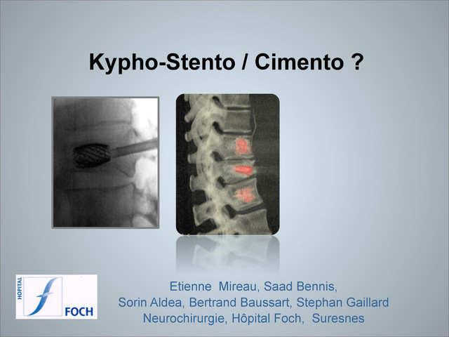 ; n=90 (104 vert) 51 vertebro / 53 kypho • pas de différence évolution clinique • radio pas de différence significative • fuite : – vertebro 5,9% dont 2 sur 3 symptomatique – kypho 1.9% ; • plus de fracture adjacente dans le groupe des kypho (7,8% vs 13.2%) • propose un ciment plus visqueux
