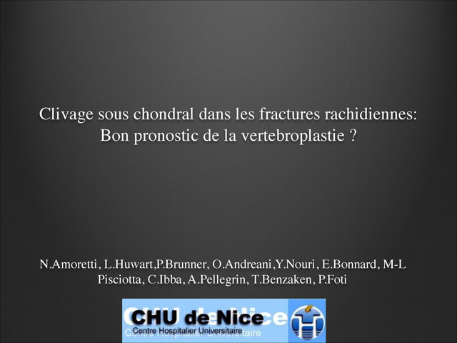 for a 13 G Trocar t’am (Thiebaud, France). ! ✓ Under CT and fluoroscopy guidance, the Trocar was guided to the junction of anterior and middle thirds of the vertebral body close to the midline, using an unilateral approach. ✓ When a cleft was noted, the Trocar was directly positioned into the cleft. ✓ A CT acquisition checked the correct positioning of the tip of the Trocar.