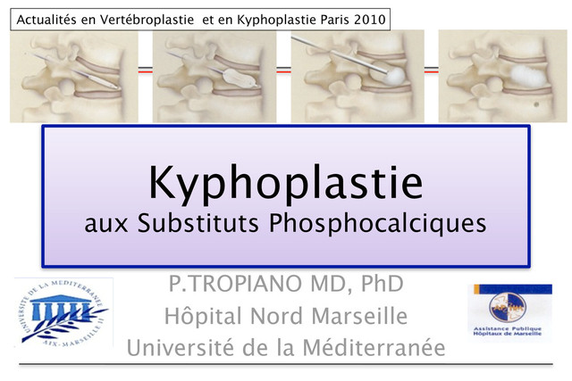 du Calcibon: bons résultats cliniques • Résultats à long terme nécessaires pour démontrer les propriétés biologiques • KyphOs (Kyphon): Utilisation difficile, car timing précis, mais résultats prometteurs. Notre expérience limitée à KPB et osteosynthèse • CPC ( < 50 ans) • Si Instabilité sévère: PMMA ou CPC+PMMA