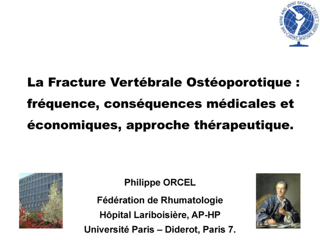 de l’ostéoporose et augmentent le risque de nouvelles fractures. Actuellement, les fractures vertébrales discrètes ou modérées ne sont pas toujours reconnues ni mentionnées, ce qui conduit à un défaut de diagnostic et de traitement de la maladie. Les fractures vertébrales induisent une morbidité et une sur mortalité, ainsi que des coûts importants. Le traitement des fractures vertébrales est encore empirique et mal codifié.