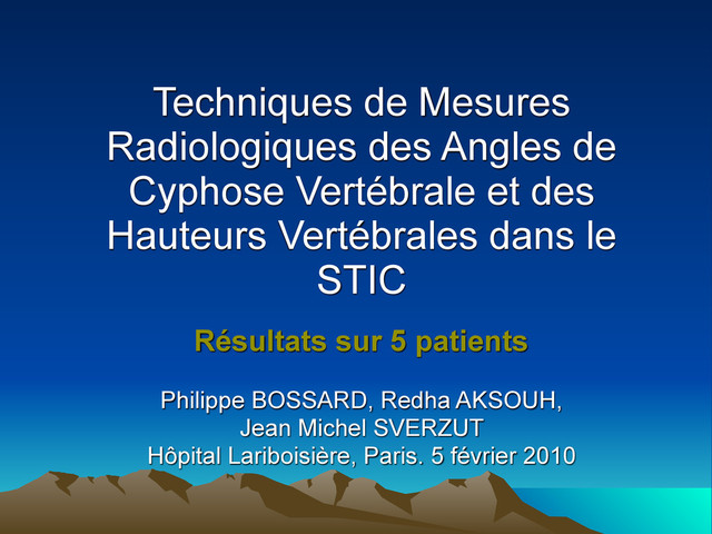 des Hauteurs Vertébrales dans le STIC Résultats sur 5 patients Philippe BOSSARD, Redha AKSOUH, Jean Michel SVERZUT Hôpital Lariboisière, Paris. 5 février 2010