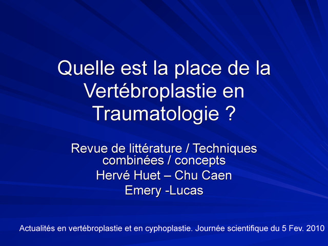 Revue de littérature / Techniques combinées / concepts Hervé Huet – Chu Caen Emery -Lucas Actualités en vertébroplastie et en cyphoplastie. Journée scientifique du 5 Fev. 2010
