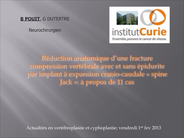 de 39 à 80 ans (M: 65,6) • Tumeur primitive: • KC Poumon: 3 • KC du sein: 3 • KC uro-vésical: 1 • KC de l’œsophage: 1 • Myélome: 3 • Niveau lésionnel • T3: 1 cas (abord bilatéral) • T9: 1 cas (abord bilatéral) • T11: 1 cas (abord bilatéral) • T12: 1 cas (abord bilatéral) • L1: 3 cas (2 : abord bilatéral, 1 tassement unilatéral → abord unilatéral) • L3: 2 cas (1 abord unilatéral, 1 abord bilatéral) • L4: 1 cas (abord unilatéral) • L5: 1 cas (abord unilatéral) Tassement cyphosant