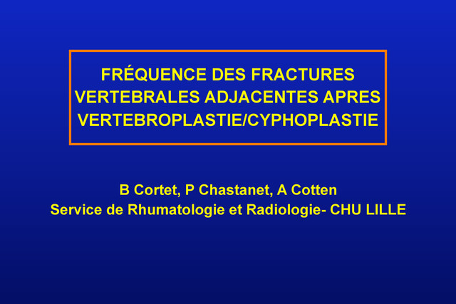 traitée par vertébroplastie semble augmenté mais on ne le prouver de manière indéniable ♦ Ce risque semble nettement moindre après cyphoplastie ♦ Il n’apparaît pas de manière statistiquement significative dans le cadre de l’étude FREE à J 1 an Conclusion