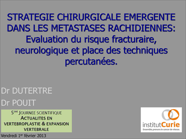 POSITIONNELLE Douleur améliorée en décubitus et/ou Positions en charge Douleur associée aux mouvements OUI 3 NON (douleur occasionnelle mais non « mécanique ») 1 Aucune douleur 0 DONNEES RADIOLOGIQUES: 2 “QUALITE” DE LA LESION OSSEUSE - Lytique 2 - Mixte (Lytique/condensante) 1 - Condensante 0 ! 3 Localisation rachidienne tumorale - Zone jonctionnelle (Occ-C2, C7-T2, T11-L1, L5-S1) 3 - Rachis mobile (C3-C6, L2-L4) 2 - Rachis semi rigide (T3-T10) 1 - Rachis rigide (S2-S5) 0 4 STATIQUE VERTEBRALE (Alignement) - Existence subluxation / listhésis 4 - Déformation de novo 2 - Alignement “normal” 0 1. ENVAHISSEMENT/TASSEMENT CORPS VERTEBRAL 2. - Fracture-tassement > 50% hauteur vertébrale 3 - Fracture-tassement < 50% hauteur vertébrale 2 - Ø tassement, envahissement corporéal > 50% 1 - Aucun élément ci-dessus 0 6 ENVAHISSEMENT DES ELEMENTS POSTERO-LATERAUX - Bilateral 3 - Unilateral 1 - Alignement “normal” 0 Date: SCORE: / 18
