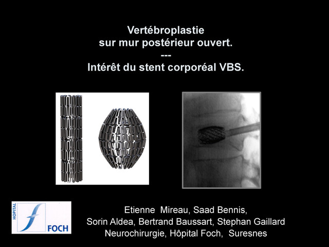 par stent corporéal VBS (Synthes) ! • Objectif : – Récupération de hauteur vertébrale – Correction de la cyphose locale – Conservation du gain avant l’injection de ciment – Amélioration des propriété mécaniques – Diminution de pression d’injection du ciment +++++