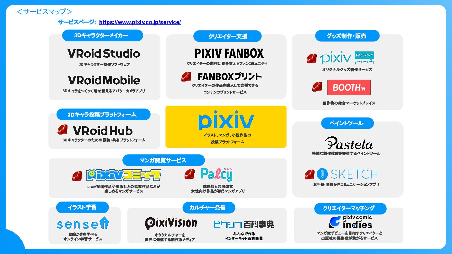 世界に発信する創作系メディア みんなで作る インターネット百科事典 ペイントツール グッズ制作・販売 3Dキャラクターメイカー 3Dキャラ投稿プラットフォーム クリエイター支援 マンガ閲覧サービス イラスト学習 カルチャー発信 <サービスマップ> 3Dキャラクター制作ソフトウェア 3Dキャラをつくって着せ替えるアバターカメラアプリ クリエイターの創作活動を支えるファンコミュニティ お手軽 お絵かきコミュニケーションアプリ オリジナルグッズ制作サービス 創作物の総合マーケットプレイス クリエイターマッチング マンガ家デビューを目指すクリエイターと 出版社の編集者が繋がるサービス サービスページ: https://www.pixiv.co.jp/service/ 快適な創作体験を提供するペイントツール クリエイターの作品を購入して支援できる コンテンツプリントサービス