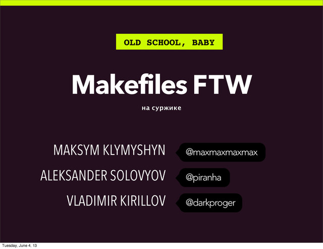Slides for Makefiles FTW Masterclass at HotCode Conference 2013. Gist with example: https://gist.github.com/joymax/5689698