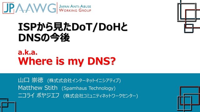 choice and control, e.g. allow end users/admins to control and configure the feature, whether they want to use a custom DoH server or just keep on using their regular DNS[...].There are no plans to force any specific resolver without user consent / opt-in.[...]We are considering a first milestone where Chrome would do an automatic upgrade to DoH when a user's existing resolver is capable of it" https://mailarchive.ietf.org/arch/msg/doh/JhFPKoyGU2JqKmUk3GEe5yjuSHI "we may have DoH/TRR on by default in some regions and not others[...].The user will be informed that we have enabled use of a TRR and have the opportunity to turn it off at that time" https://mailarchive.ietf.org/arch/msg/doh/po6GCAJ52BAKuyL-dZiU91v6hLw ・デフォルト化予定なし ・管理者コントロールも考慮 ・現行リゾルバがDoH対応 していれば、DoHへ自動 アップグレードする →opportunistic DoH? ・デフォルト化予定あり (米国等) ・ユーザへ告知、無効化オプ ションを提供