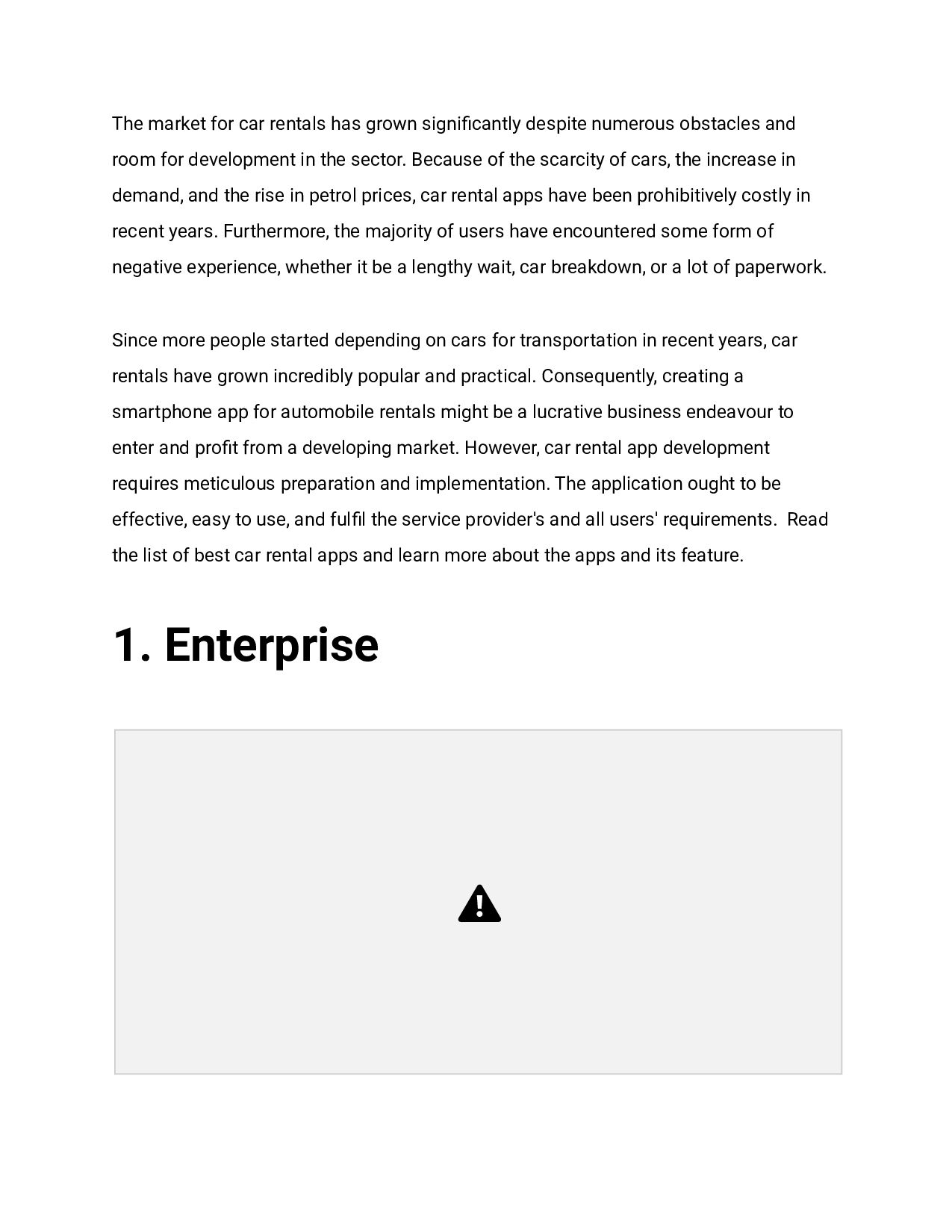 obstacles and room for development in the sector. Because of the scarcity of cars, the increase in demand, and the rise in petrol prices, car rental apps have been prohibitively costly in recent years. Furthermore, the majority of users have encountered some form of negative experience, whether it be a lengthy wait, car breakdown, or a lot of paperwork. Since more people started depending on cars for transportation in recent years, car rentals have grown incredibly popular and practical. Consequently, creating a smartphone app for automobile rentals might be a lucrative business endeavour to enter and profit from a developing market. However, car rental app development requires meticulous preparation and implementation. The application ought to be effective, easy to use, and fulfil the service provider's and all users' requirements. Read the list of best car rental apps and learn more about the apps and its feature. 1. Enterprise
