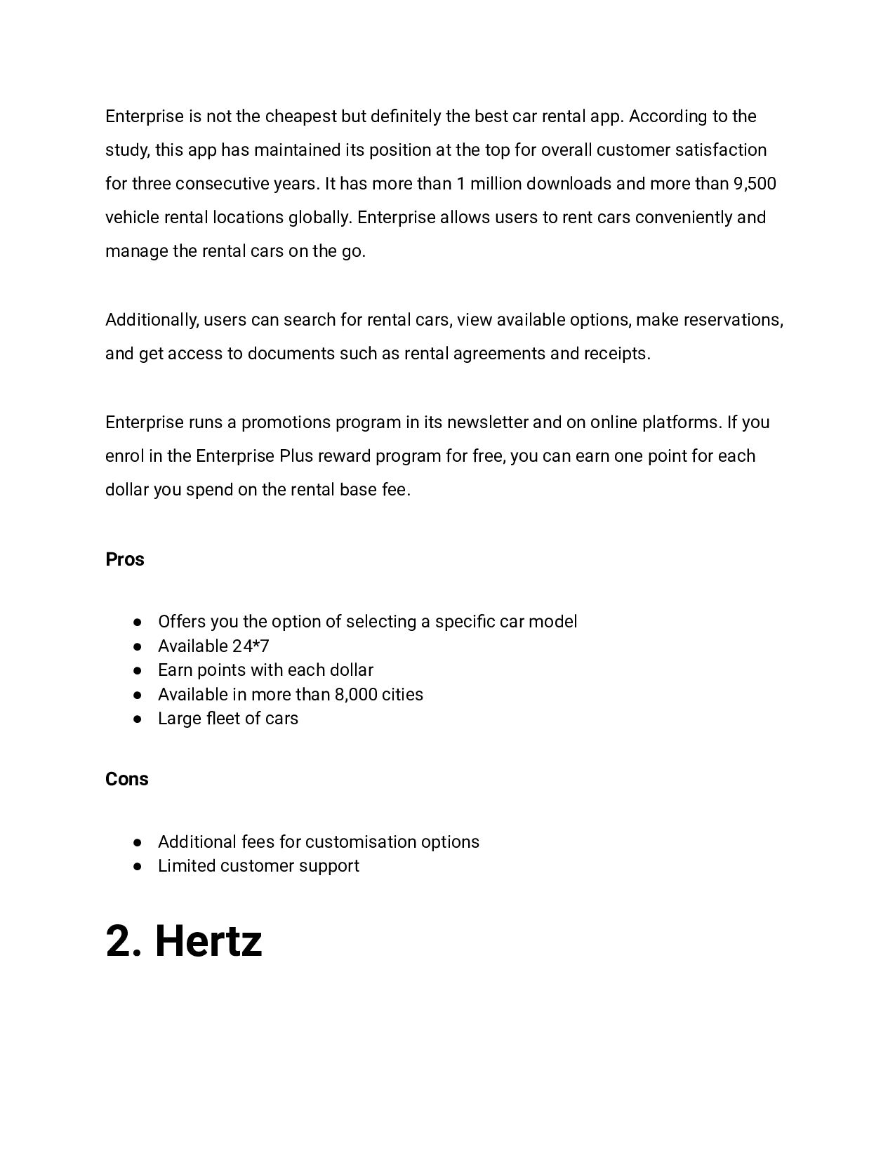 rental app. According to the study, this app has maintained its position at the top for overall customer satisfaction for three consecutive years. It has more than 1 million downloads and more than 9,500 vehicle rental locations globally. Enterprise allows users to rent cars conveniently and manage the rental cars on the go. Additionally, users can search for rental cars, view available options, make reservations, and get access to documents such as rental agreements and receipts. Enterprise runs a promotions program in its newsletter and on online platforms. If you enrol in the Enterprise Plus reward program for free, you can earn one point for each dollar you spend on the rental base fee. Pros • Offers you the option of selecting a specific car model • Available 24*7 • Earn points with each dollar • Available in more than 8,000 cities • Large fleet of cars Cons • Additional fees for customisation options • Limited customer support 2. Hertz