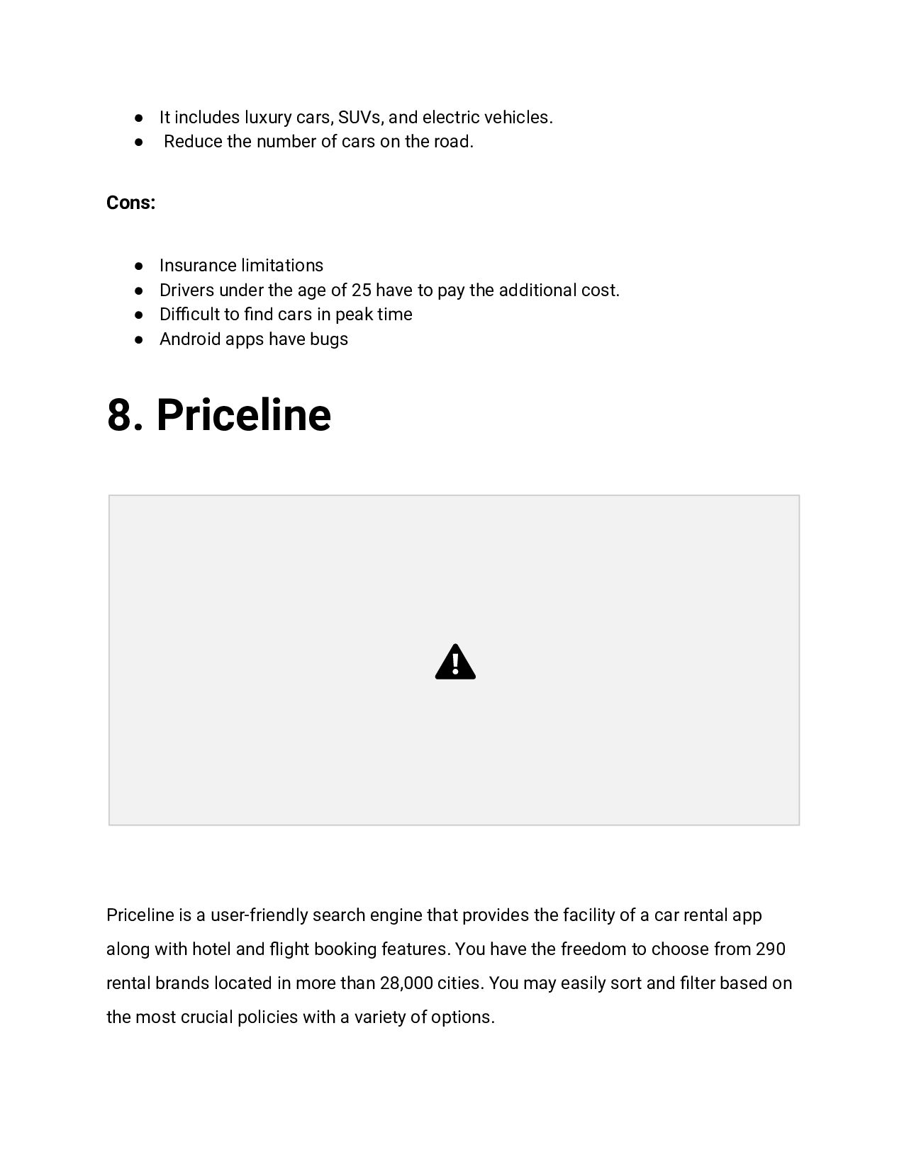 Reduce the number of cars on the road. Cons: • Insurance limitations • Drivers under the age of 25 have to pay the additional cost. • Difficult to find cars in peak time • Android apps have bugs 8. Priceline Priceline is a user-friendly search engine that provides the facility of a car rental app along with hotel and flight booking features. You have the freedom to choose from 290 rental brands located in more than 28,000 cities. You may easily sort and filter based on the most crucial policies with a variety of options.