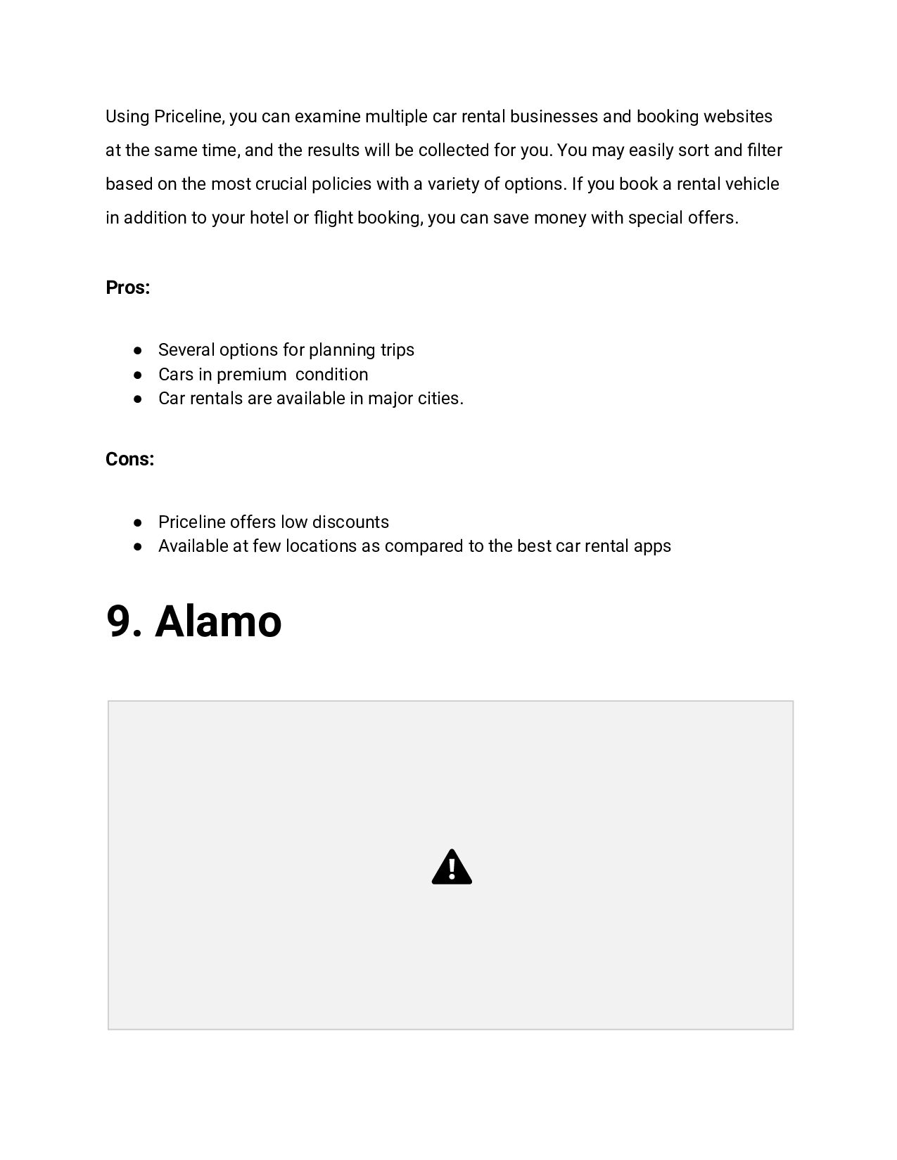 booking websites at the same time, and the results will be collected for you. You may easily sort and filter based on the most crucial policies with a variety of options. If you book a rental vehicle in addition to your hotel or flight booking, you can save money with special offers. Pros: • Several options for planning trips • Cars in premium condition • Car rentals are available in major cities. Cons: • Priceline offers low discounts • Available at few locations as compared to the best car rental apps 9. Alamo