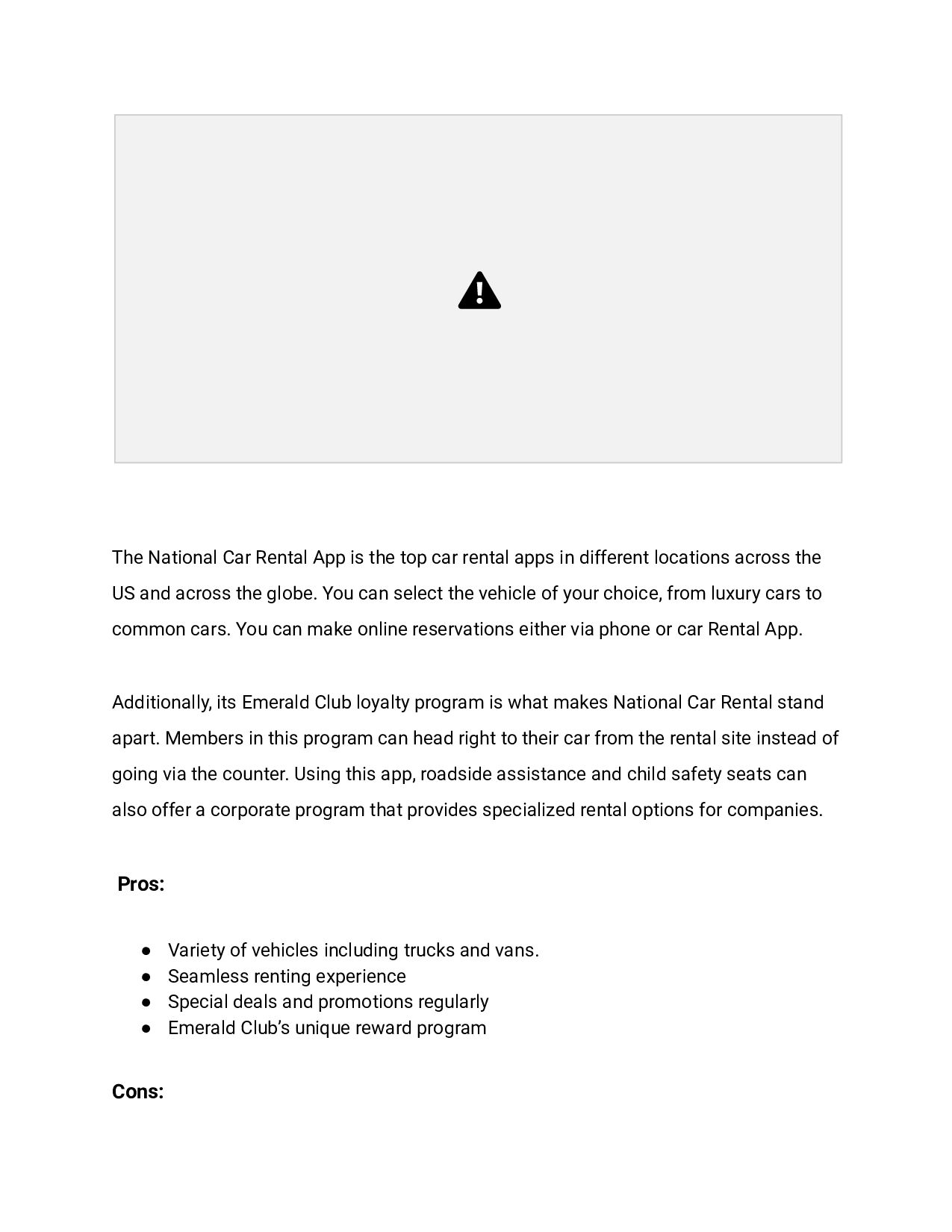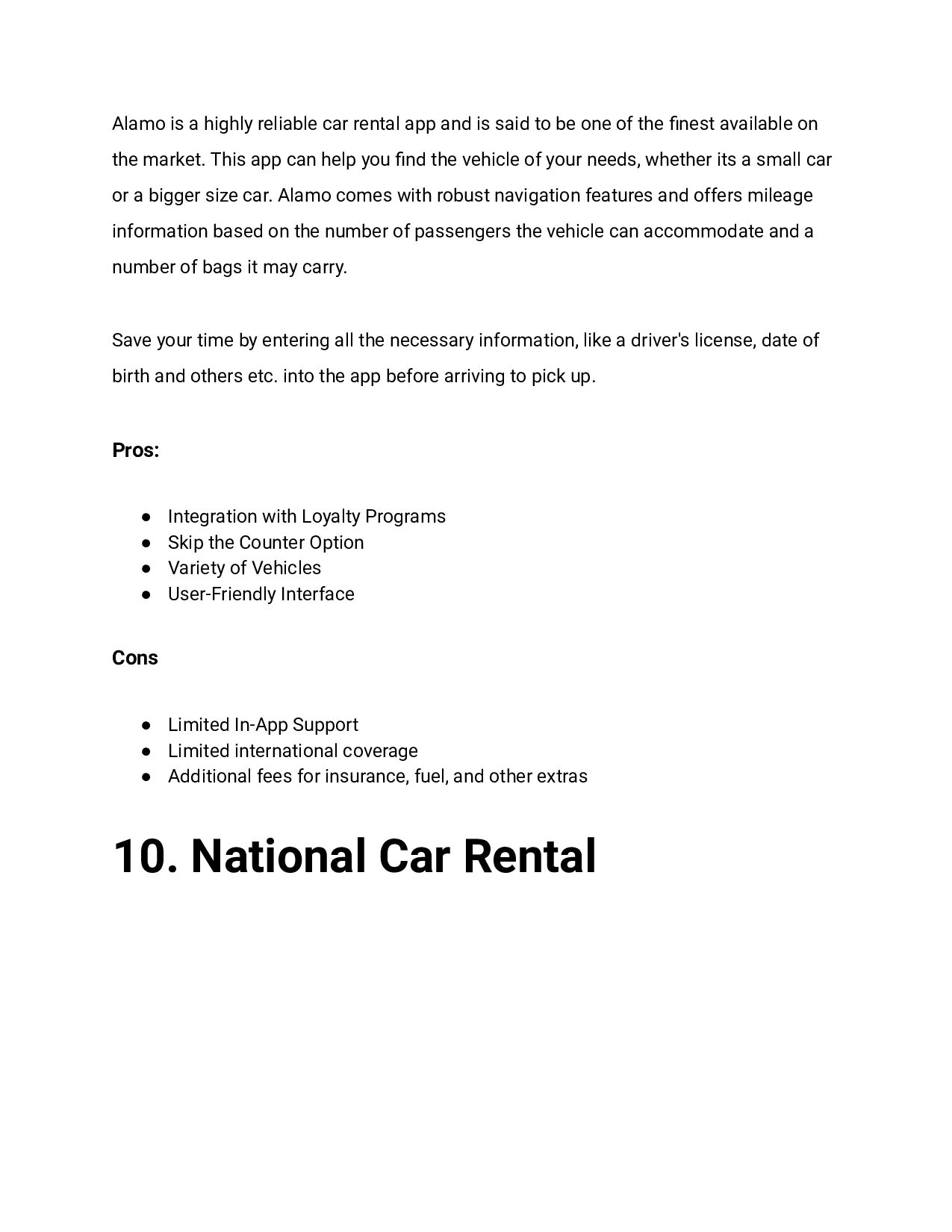 said to be one of the finest available on the market. This app can help you find the vehicle of your needs, whether its a small car or a bigger size car. Alamo comes with robust navigation features and offers mileage information based on the number of passengers the vehicle can accommodate and a number of bags it may carry. Save your time by entering all the necessary information, like a driver's license, date of birth and others etc. into the app before arriving to pick up. Pros: • Integration with Loyalty Programs • Skip the Counter Option • Variety of Vehicles • User-Friendly Interface Cons • Limited In-App Support • Limited international coverage • Additional fees for insurance, fuel, and other extras 10. National Car Rental