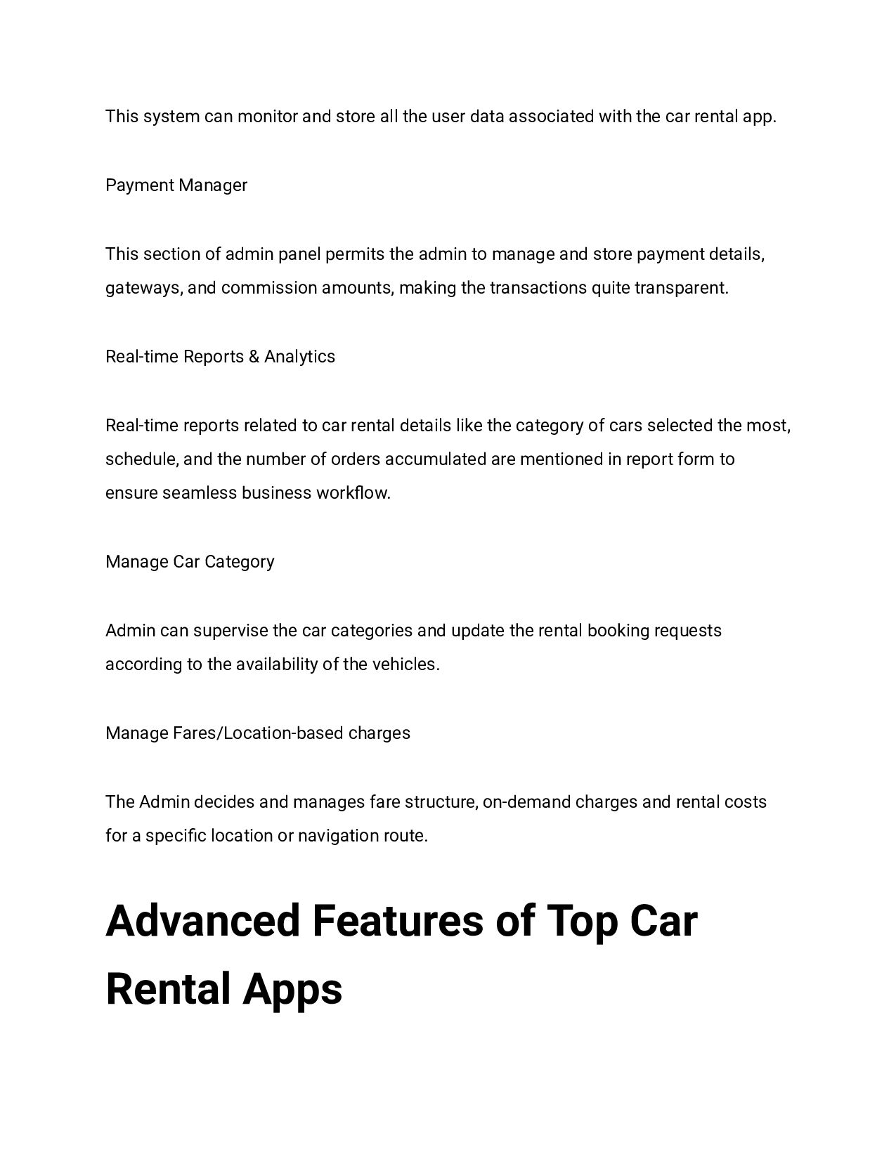 associated with the car rental app. Payment Manager This section of admin panel permits the admin to manage and store payment details, gateways, and commission amounts, making the transactions quite transparent. Real-time Reports & Analytics Real-time reports related to car rental details like the category of cars selected the most, schedule, and the number of orders accumulated are mentioned in report form to ensure seamless business workflow. Manage Car Category Admin can supervise the car categories and update the rental booking requests according to the availability of the vehicles. Manage Fares/Location-based charges The Admin decides and manages fare structure, on-demand charges and rental costs for a specific location or navigation route. Advanced Features of Top Car Rental Apps