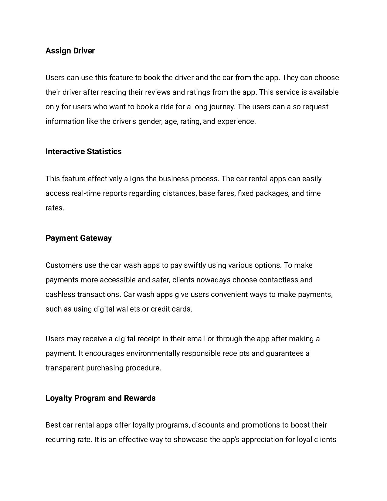 driver and the car from the app. They can choose their driver after reading their reviews and ratings from the app. This service is available only for users who want to book a ride for a long journey. The users can also request information like the driver's gender, age, rating, and experience. Interactive Statistics This feature effectively aligns the business process. The car rental apps can easily access real-time reports regarding distances, base fares, fixed packages, and time rates. Payment Gateway Customers use the car wash apps to pay swiftly using various options. To make payments more accessible and safer, clients nowadays choose contactless and cashless transactions. Car wash apps give users convenient ways to make payments, such as using digital wallets or credit cards. Users may receive a digital receipt in their email or through the app after making a payment. It encourages environmentally responsible receipts and guarantees a transparent purchasing procedure. Loyalty Program and Rewards Best car rental apps offer loyalty programs, discounts and promotions to boost their recurring rate. It is an effective way to showcase the app's appreciation for loyal clients