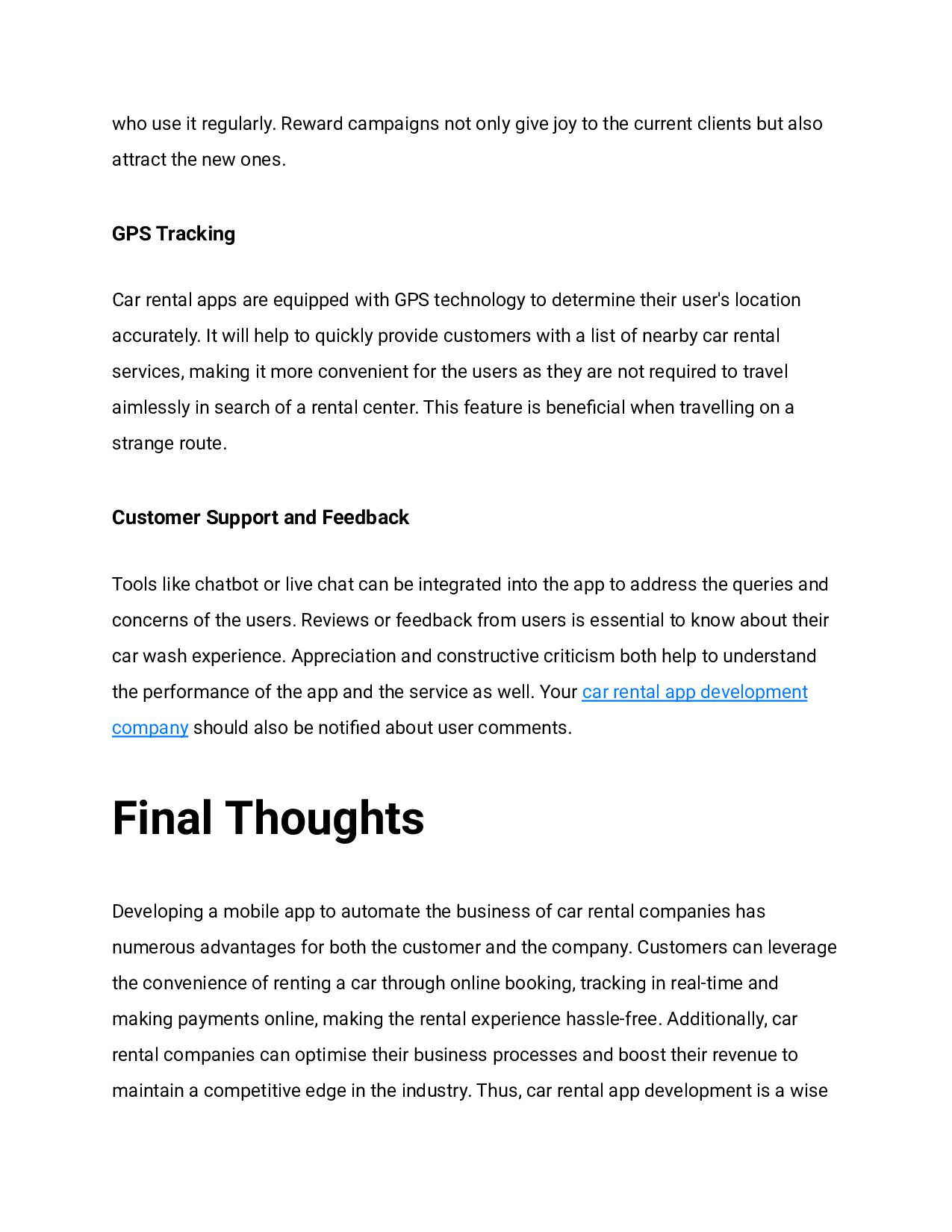 to the current clients but also attract the new ones. GPS Tracking Car rental apps are equipped with GPS technology to determine their user's location accurately. It will help to quickly provide customers with a list of nearby car rental services, making it more convenient for the users as they are not required to travel aimlessly in search of a rental center. This feature is beneficial when travelling on a strange route. Customer Support and Feedback Tools like chatbot or live chat can be integrated into the app to address the queries and concerns of the users. Reviews or feedback from users is essential to know about their car wash experience. Appreciation and constructive criticism both help to understand the performance of the app and the service as well. Your car rental app development company should also be notified about user comments. Final Thoughts Developing a mobile app to automate the business of car rental companies has numerous advantages for both the customer and the company. Customers can leverage the convenience of renting a car through online booking, tracking in real-time and making payments online, making the rental experience hassle-free. Additionally, car rental companies can optimise their business processes and boost their revenue to maintain a competitive edge in the industry. Thus, car rental app development is a wise