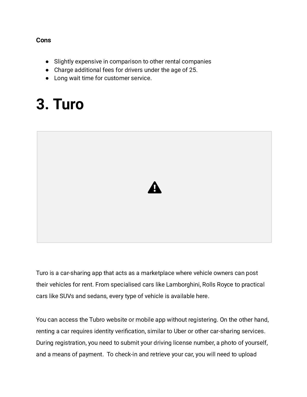 • Charge additional fees for drivers under the age of 25. • Long wait time for customer service. 3. Turo Turo is a car-sharing app that acts as a marketplace where vehicle owners can post their vehicles for rent. From specialised cars like Lamborghini, Rolls Royce to practical cars like SUVs and sedans, every type of vehicle is available here. You can access the Tubro website or mobile app without registering. On the other hand, renting a car requires identity verification, similar to Uber or other car-sharing services. During registration, you need to submit your driving license number, a photo of yourself, and a means of payment. To check-in and retrieve your car, you will need to upload