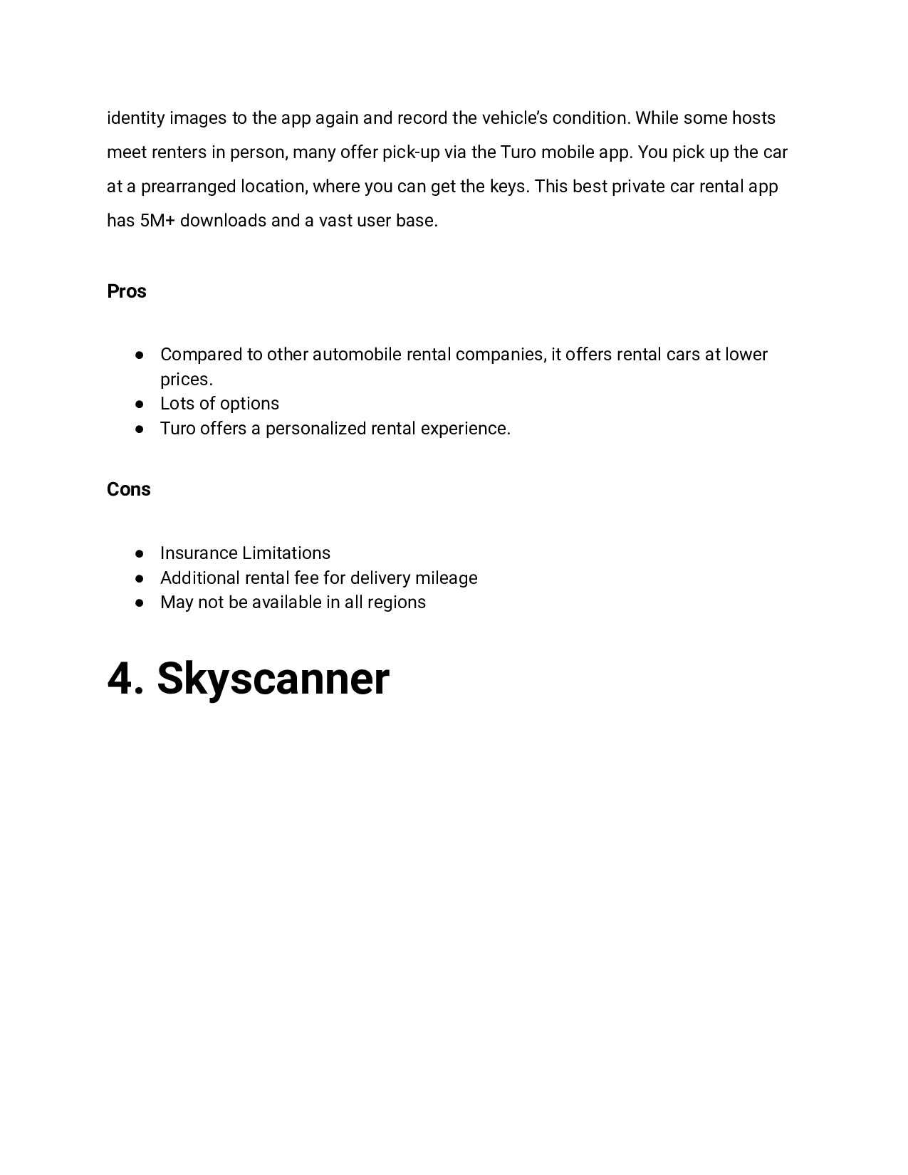 condition. While some hosts meet renters in person, many offer pick-up via the Turo mobile app. You pick up the car at a prearranged location, where you can get the keys. This best private car rental app has 5M+ downloads and a vast user base. Pros • Compared to other automobile rental companies, it offers rental cars at lower prices. • Lots of options • Turo offers a personalized rental experience. Cons • Insurance Limitations • Additional rental fee for delivery mileage • May not be available in all regions 4. Skyscanner