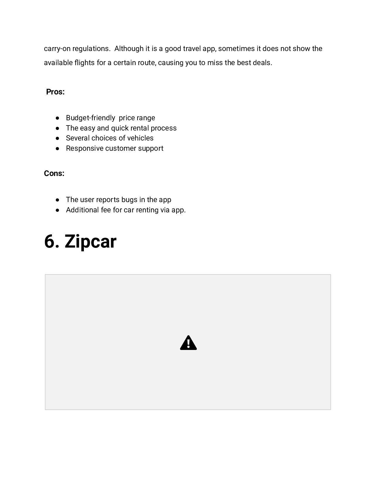 it does not show the available flights for a certain route, causing you to miss the best deals. Pros: • Budget-friendly price range • The easy and quick rental process • Several choices of vehicles • Responsive customer support Cons: • The user reports bugs in the app • Additional fee for car renting via app. 6. Zipcar