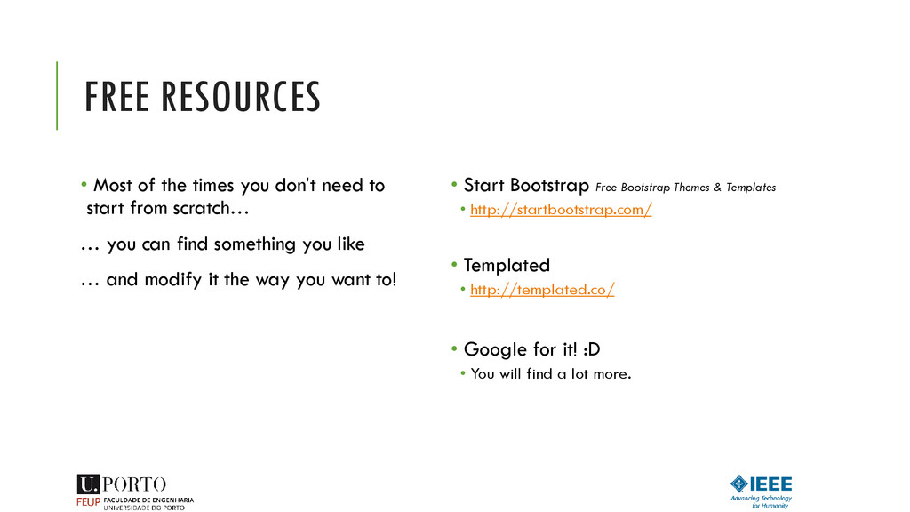 to store your website to be public available. For this you will need a server. • You can pay for it… • Build your own server… • Get it for (almost) free! • GitHub Pages (https://pages.github.com/) • You will need to know a little bit of git. • 000webhost (http://www.000webhost.com/) • You will get some ads. • Some ways to get a website up using Dropbox (http://www.maketecheasier.com/4-ways-to- host-your-website-on-dropbox/) • Some universities provide the service for free.