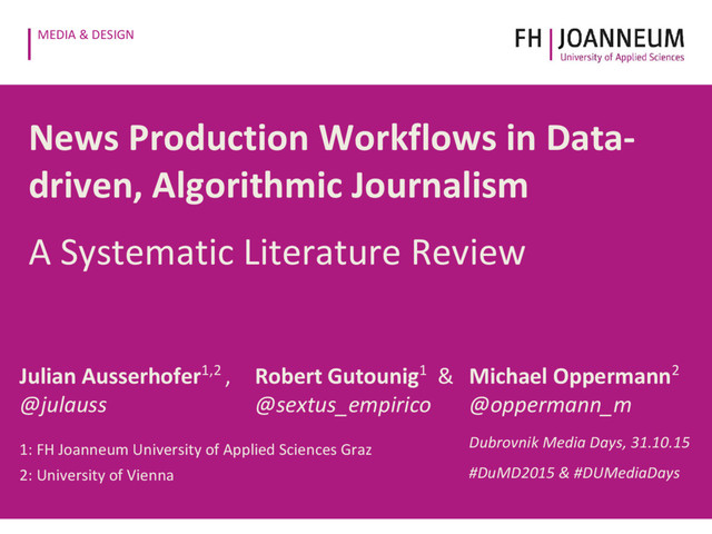 Ausserhofer, J., Gutounig, R., & Oppermann, M. (2015, October). News Production Workflows in Data-driven, Algorithmic Journalism: A Systematic Literature Review. Presented at the Dubrovnik Media Days, Dubrovnik.
