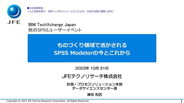 2023/10/31に開催されたSPSS 秋のユーザーイベントのご講演 JFEテクノリサーチ株式会社 津田 和呂様 「ものづくり領域で活かされるSPSS Modelerの今とこれから 」 のスライド資料(公開版)です。