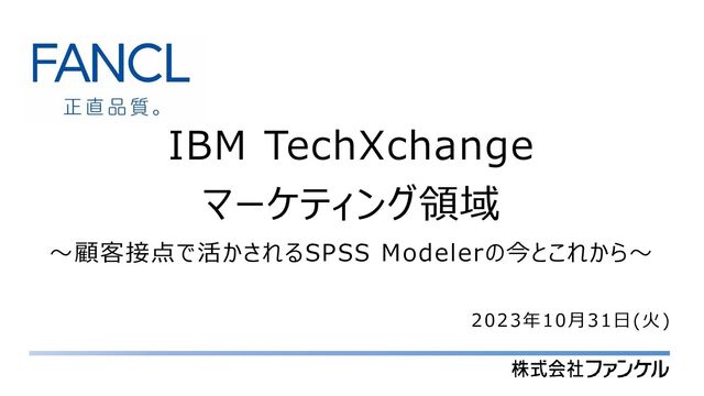 2023/10/31に開催されたSPSS 秋のユーザーイベントのご講演 株式会社ファンケル 真弓 裕貴様 「顧客接点で活かされるSPSS Modelerの今とこれから 」 のスライド資料(公開版)です。