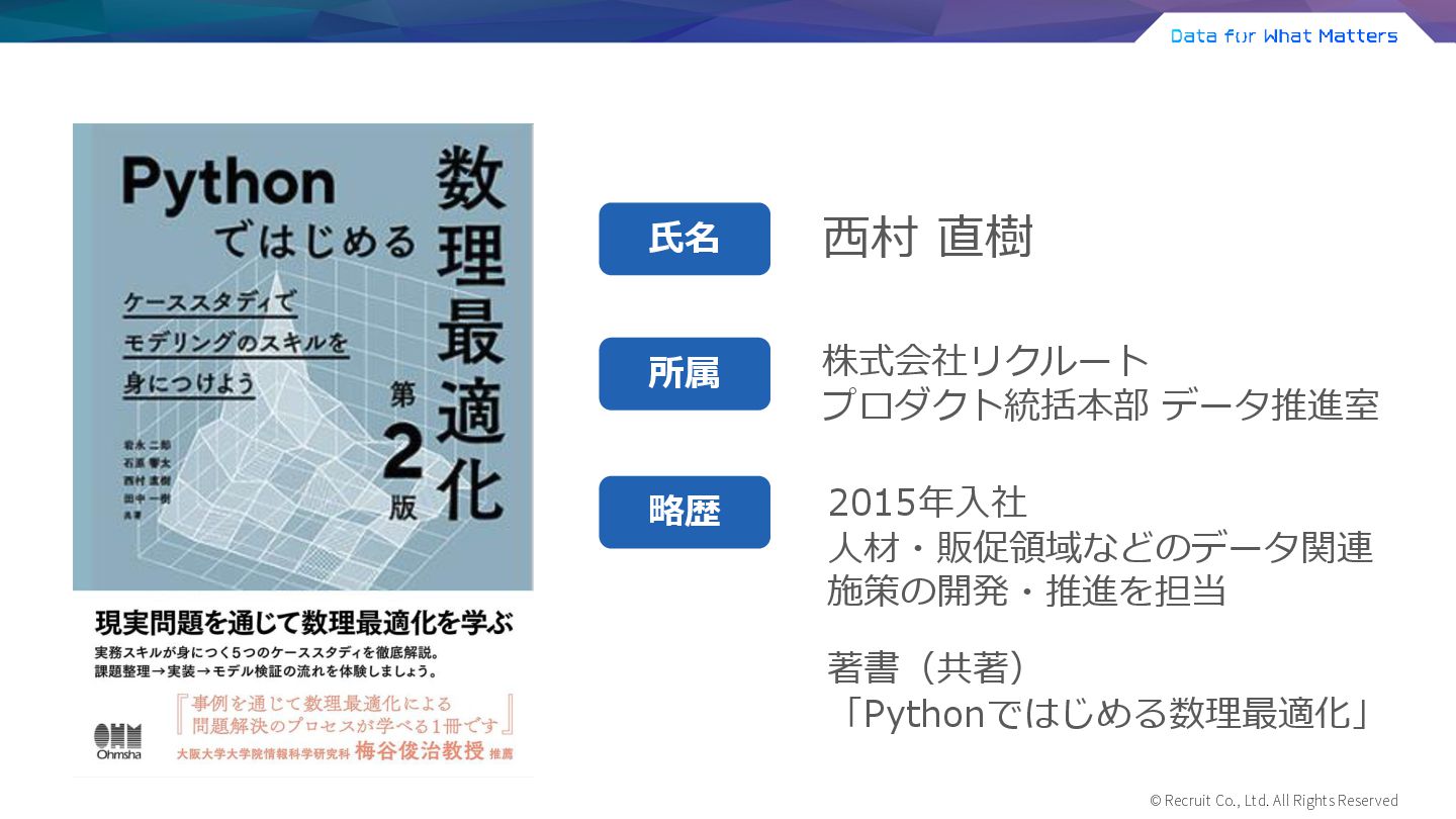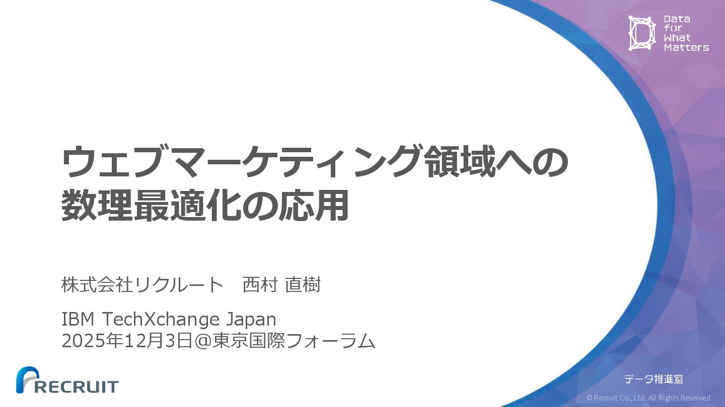 2025-12-03に開催されたIBM TechXchange Summit Japan Data Science (G609-4) リクルート 西村 直樹 様による ウェブマーケティング領域への数理最適化の応用 のスライド資料(公開版)です。